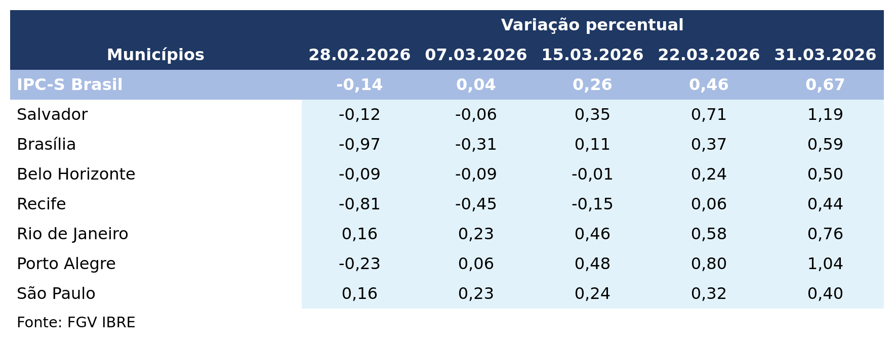 No País, o IPC-S subiu de 0,46% para 0,67%. Com esse resultado, o indicador acumula variação de 3,47% nos últimos 12 meses.