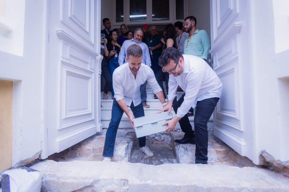 Às vésperas do término das obras do prédio da Casa Civil, na rua Duque de Caxias, no Centro Histórico de Porto Alegre, um gesto simbólico reforça a conexão entre passado, presente e futuro. Uma cápsula do tempo foi colocada na porta principal da edificação nesta quinta-feira (6) pelo governador Eduardo Leite e pelo secretário-chefe da Casa Civil, Artur Lemos, marcando a etapa final de requalificação da estrutura, que integra o Complexo Palácio Piratini. A cápsula deverá ser aberta daqui a 50 anos, em 2075.