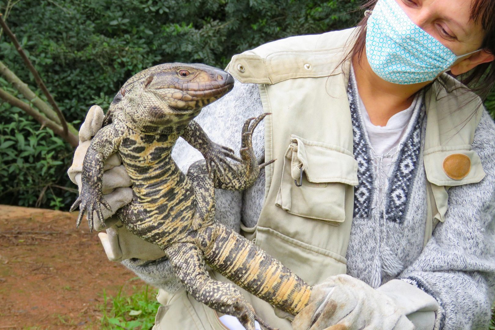 A principal orientação é manter distância e garantir uma rota de fuga para o animal, evitando qualquer tentativa de captura. Também é importante recolher ração de cães e gatos, manter lixeiras bem fechadas, não deixar restos de alimentos no pátio, manter os cães contidos, limpar entulhos, roçar vegetação alta e fechar vãos sob portões, decks e residências. Essas medidas reduzem locais de abrigo e fontes de alimento que atraem o lagarto.