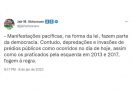 “Manifestações pacíficas, na forma da lei, fazem parte da democracia. Contudo, depredações e invasões de prédios públicos como ocorridos no dia de hoje, assim como os praticados pela esquerda em 2013 e 2017, fogem à regra”, escreveu Bolsonaro.