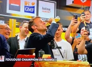 A cena de Macron esvaziando a garrafa de cerveja em aproximadamente 17 segundos, sob gritos e aplausos dos jogadores e equipe técnica, ocorreu durante a comemoração do Toulouse pela vitória sobre a equipe europeia La Rochelle de 29 por 26 pontos.