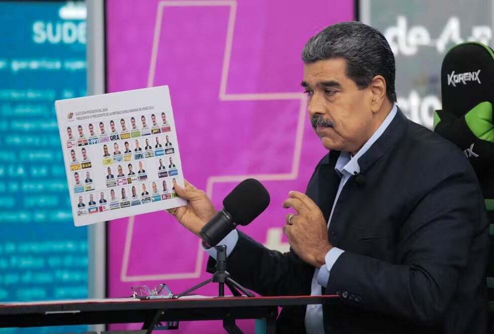 O presidente da Venezuela, Nicolás Maduro, mostrou em um programa de TV uma cédula de votação na qual seu nome e sua foto aparecem 13 vezes, incluindo todos os dez espaços da primeira fileira.