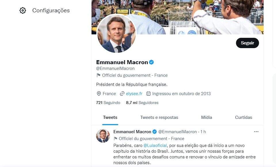 “Parabéns, caro Lula, por sua eleição, que dá início a um novo capítulo da história do Brasil”, escreveu o líder francês, Emmanuel Macron, no Twitter, em português.