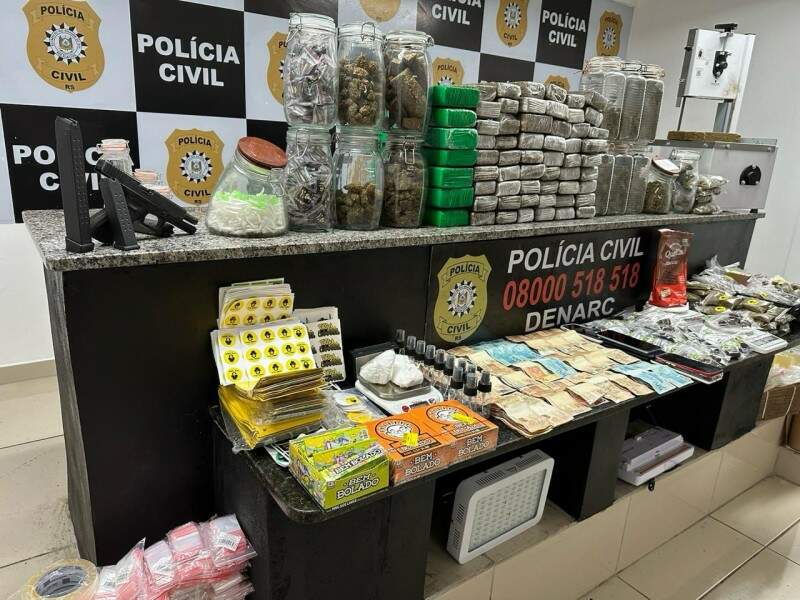 No local, os agentes apreenderam 45 quilos de maconha em tijolos, 1 quilo de cocaína em porções, 6 quilos de maconha em porções, 710 gramas de skunk e brownies recheados com maconha. Os policiais também apreenderam quatro veículos, uma pistola calibre 9 milímetros e aproximadamente R$ 3 mil em dinheiro.