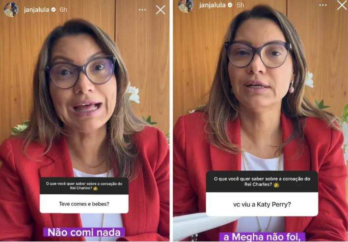 Janja explicou de forma genérica os dois momentos distintos da visita ao Reino Unido, com o encontro do monarca com chefes de Estado, realizado na sexta-feira (5), e a cerimônia de coroação, ocorrida no dia seguinte. Ao ser questionada sobre o tipo de comida servida, a primeira-dama disse não ter comido nada, por falta de tempo: “Que tipo de comida foi servida na recepção? Não sei. Não comi nada porque não deu tempo! Todos os chefes de estado queriam conversar com o presidente Lula, queriam conversar com a gente, eu nem consegui ver comida. Eu mal tomei um copo d´água nessa recepção. Não foi um jantar, foi uma recepção que durou duas horas, mais ou menos”, disse.