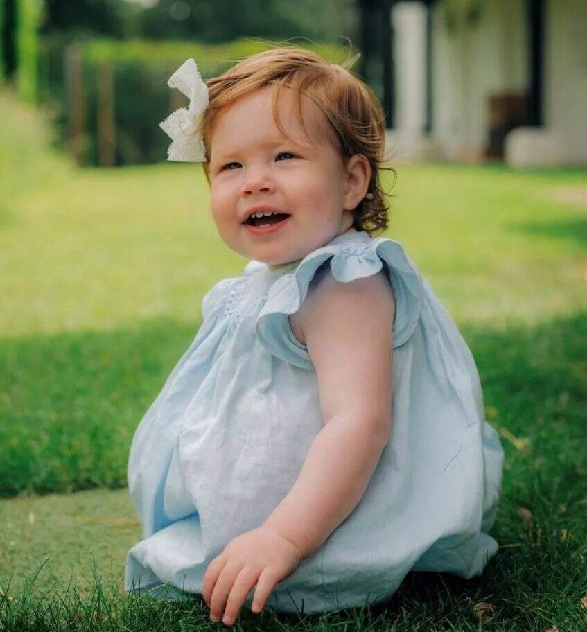 Usando um vestido azul claro e um laço branco na cabeça, a criança aparece sentada na grama em uma imagem registrada pelo fotógrafo e amigo da família Misan Harriman, no sábado (04).