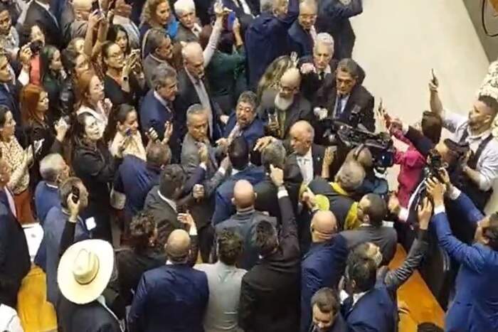 No momento, parlamentares governistas entoavam o nome do presidente Luiz Inácio Lula da Silva (PT), que estava na sessão solene. Oposicionistas, por outro lado, protestavam contra Lula.