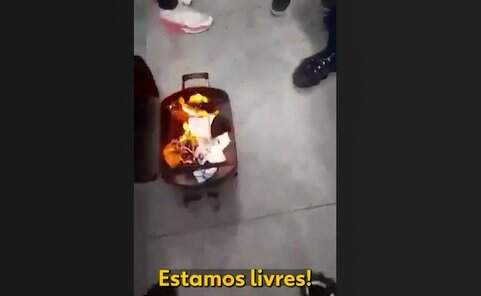 Um estudante da escola registrou com entusiasmo o momento em que o professor incendiou a primeira máscara e a jogou junto às demais na churrasqueira portátil. A gravação tem cerca de dois minutos.