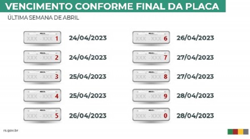 O vencimento do imposto ocorre a partir da última semana de abril, conforme cronograma estabelecido pela Receita Estadual. O contribuinte que pagar o tributo no próximo mês não terá o desconto de antecipação, mas receberá as reduções do Bom Motorista e do Bom Cidadão até a data de vencimento da placa, caso tenha direito aos benefícios.