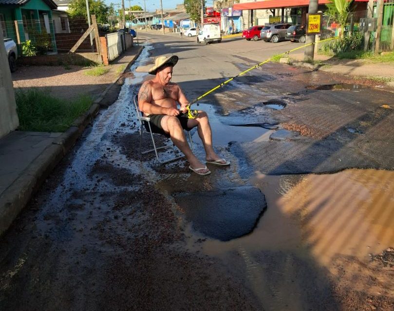 Um protesto criativo e ao mesmo tempo preocupante chamou a atenção de motoristas e pedestres que circulavam pela Avenida dos Soares, no bairro São Lucas, em Viamão, na Região Metropolitana de Porto Alegre. Em frente ao número 636, o morador Fábio Martins da Rosa decidiu “pescar” em meio aos buracos cheios de água que tomaram conta da via, transformando-a em um cenário que mais lembra uma piscina a céu aberto.