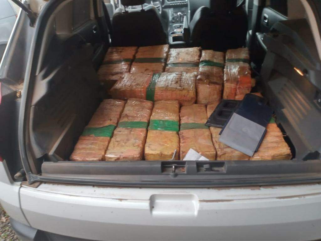 Após perseguição e cerco na região, ele foi encontrado entrando em um sítio. No local foram presos quatro criminosos com idades entre 27 e 49 anos, todos com várias ocorrências. Havia cerca de meia tonelada de maconha no carro, que foi roubado em Guaíba há quase dois meses e estava com placas clonadas.