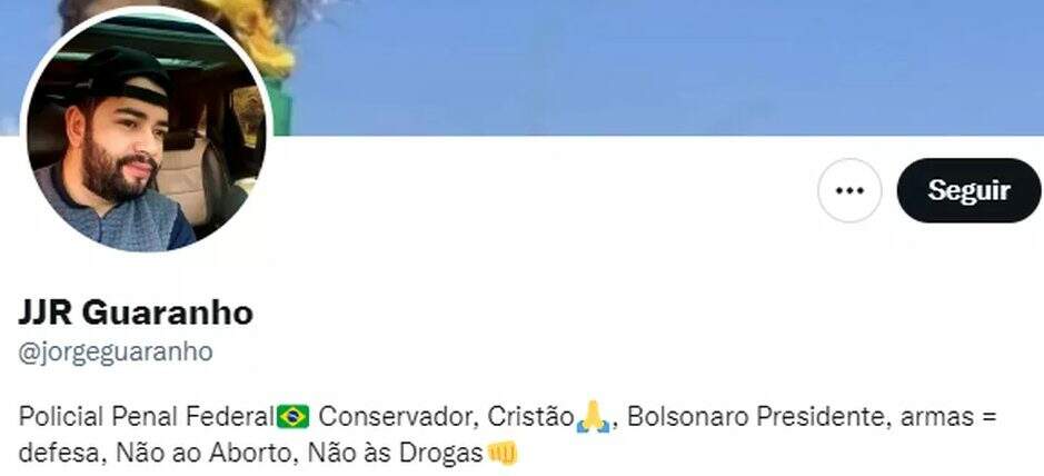 O agente penitenciário federal Jorge Jose da Rocha Guaranho, apoiador do presidente Jair Bolsonaro que, segundo a Polícia Civil, matou o guarda municipal e tesoureiro do PT Marcelo Aloizio de Arruda, se define em seu texto de apresentação no Twitter como policial penal federal, conservador e cristão. Também diz que armas são sinônimo de defesa.