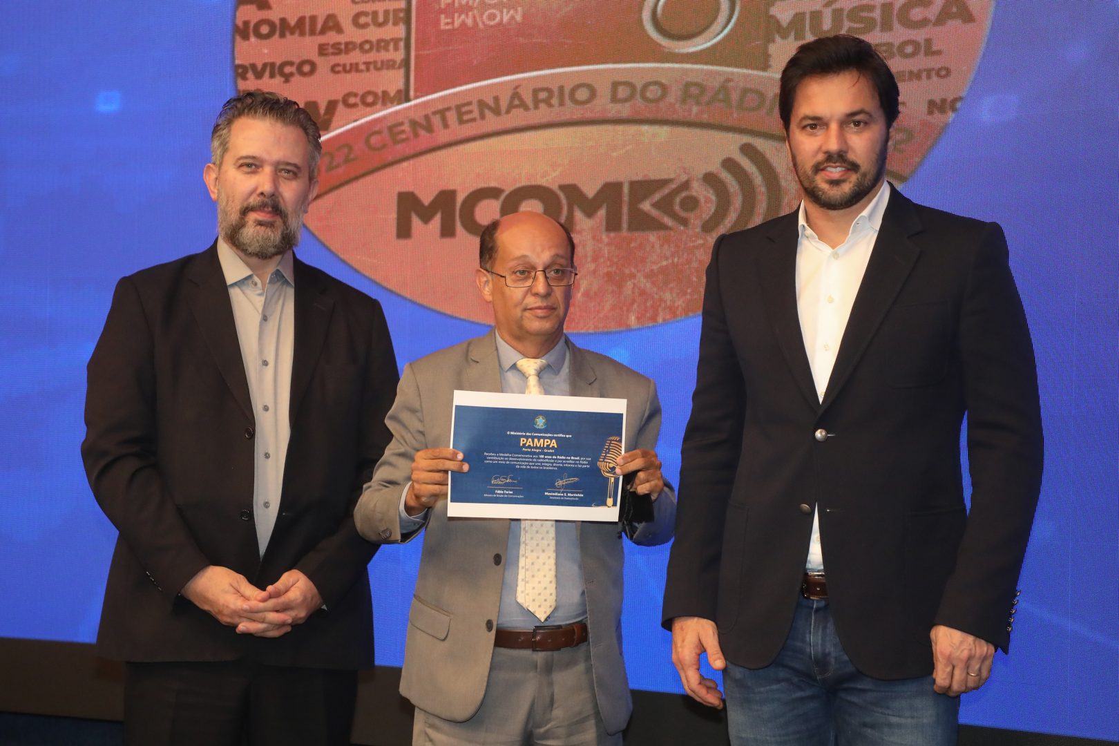 Em cerimônia alusiva aos 100 anos do Rádio no Brasil, o Ministério das Comunicações (MCom) homenageou a Rádio Pampa (97,5 FM) “por sua contribuição ao desenvolvimento da radiodifusão e por acreditar no Rádio como um meio de comunicação que une, integra, diverte, informa e faz parte da vida de todos os brasileiros”.