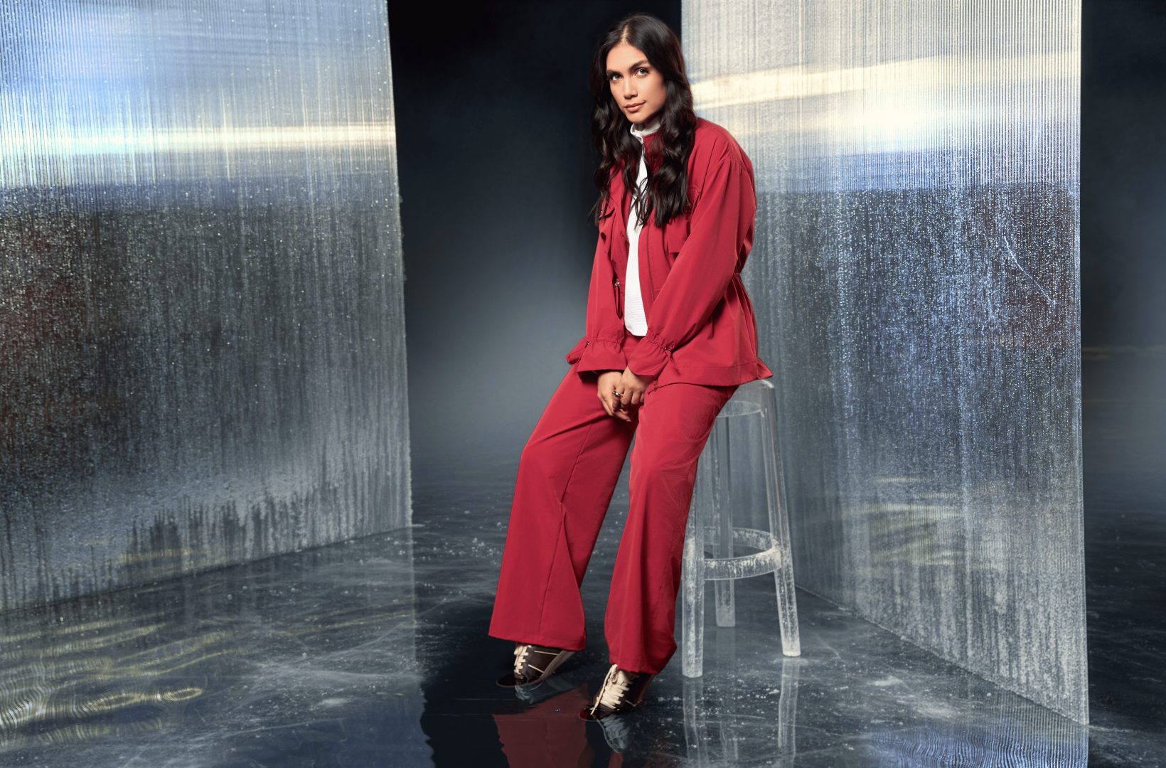 A água representa o tempo como metáfora central da campanha, elemento que flui, se adapta e se transforma, assim como a rotina de quem veste Rala Bela.
