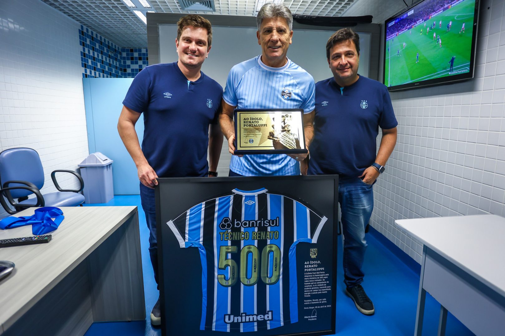 Antes do jogo de quarta-feira (17) à noite, diante do Athletico-PR, válido pela segunda rodada do Campeonato Brasileiro 2024, o técnico Renato Portaluppi foi homenageado pela marca histórica de 500 jogos como treinador do Grêmio. O feito foi alcançado na partida contra o Huachipato, pela Copa Libertadores, no dia 9.