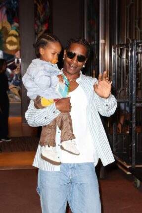 O rapper A$AP Rocky também sorria e acenava para os fãs com o pequeno RZA nos braços. Ele manteve seu visual casual com jeans, camiseta branca e jaqueta listrada de botões. A$AP acrescentou sapatos sociais pretos, óculos de sol de aviador, um colar de ouro e brincos para completar seu traje.