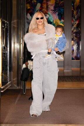 A cantora e empresária de 36 anos, sorriu enquanto carregava Riot, de oito meses. Fashionista mais pesquisada na história do Google, Rihanna usava calças jeans largas cinzas, uma camisa de seda prateada sem alças e um casaco oversized cinza felpudo. Ela complementou o look com saltos pontiagudos metálicos, óculos de sol ovais e um colar prateado.