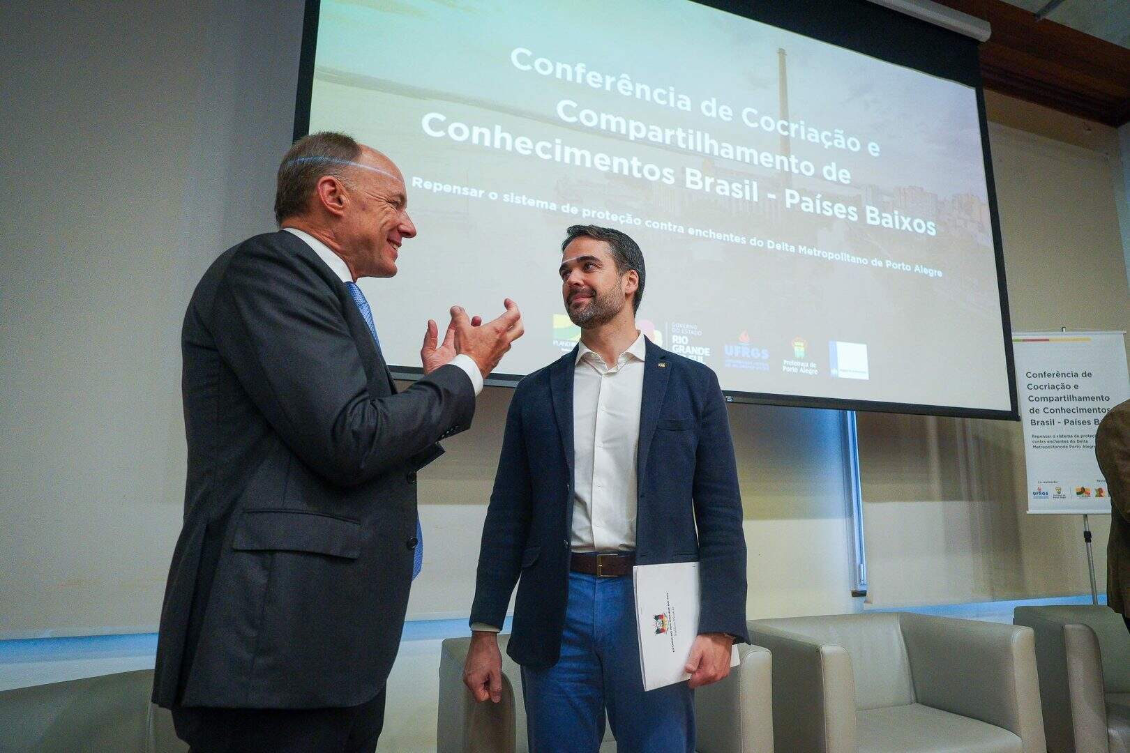 O governador Eduardo Leite e o embaixador do Reino dos Países Baixos, André Driessen, abriram, nesta terça-feira (20), a Conferência de Cocriação e Compartilhamento de Conhecimento Brasil – Países Baixos, que discute as soluções para o enfrentamento das enchentes no Rio Grande do Sul. O debate visa aprimorar o sistema de proteção contra cheias na Região Metropolitana de Porto Alegre.