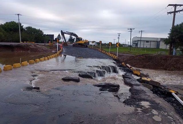 A ponte sobre o rio Taquari, em Bento Gonçalves, no limite com São Valentim do Sul, cedeu e a pista está alagada. Por isso, há bloqueio total do tráfego entre o km 10 e o km 23.