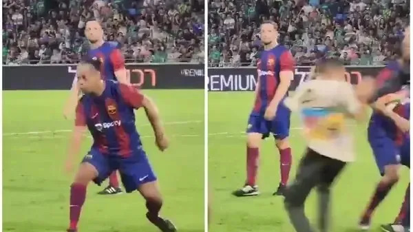 Ronaldinho Gaúcho ainda esbanja agilidade aos 43 anos. O “Bruxo”, como é conhecido pelos torcedores, participou na última quarta-feira de um jogo de lendas do Barcelona, em Israel, e chamou atenção por uma cena inusitada. O ex-jogador driblou um torcedor que invadiu o campo para abraçá-lo. As imagens viralizaram nas redes sociais.