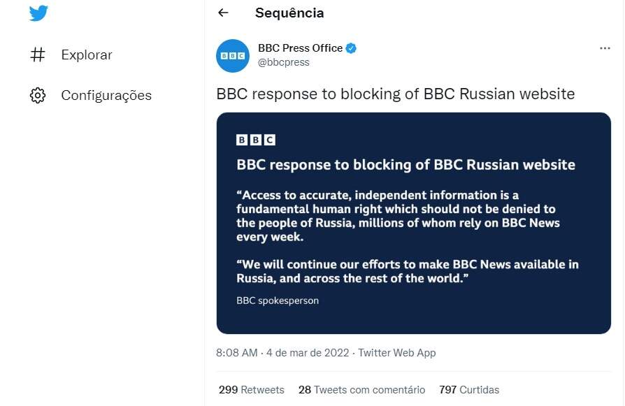 No início da semana, a emissora inglesa disse que a audiência do site de notícias em russo da BBC mais do que triplicou sua média semanal no ano e que sua página ao vivo em russo para cobertura da invasão foi o site mais visitado em todo o serviço mundial da BBC fora da língua inglesa, com 5,3 milhões de visualizações.