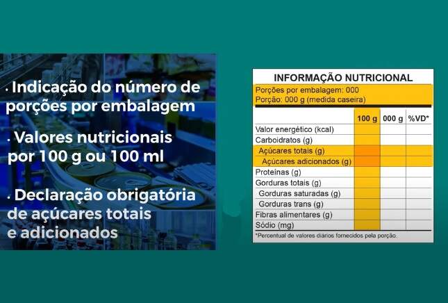 A tabela de informação nutricional agora é branca com letras pretas para ressaltar a informação. É obrigatória a declaração de açúcares totais e adicionados, do valor energético e de nutrientes por 100 g ou 100 ml, para facilitar a comparação de produtos, bem como o número de porções por embalagem.