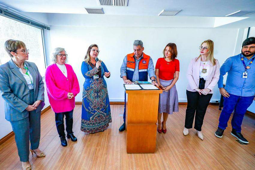O prefeito Sebastião Melo sancionou na manhã desta terça-feira (09), a lei que institui a Marca de Responsabilidade Social Contra a Violência Doméstica, em ato no Centro Administrativo Municipal Guilherme Socias Villela.