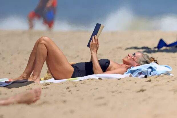 Sem maquiagem, com cabelos presos e óculos de sol, a atriz de 57 anos renovou o bronzeado e leu enquanto curtia um dia de praia com o marido Matthew Broderick.