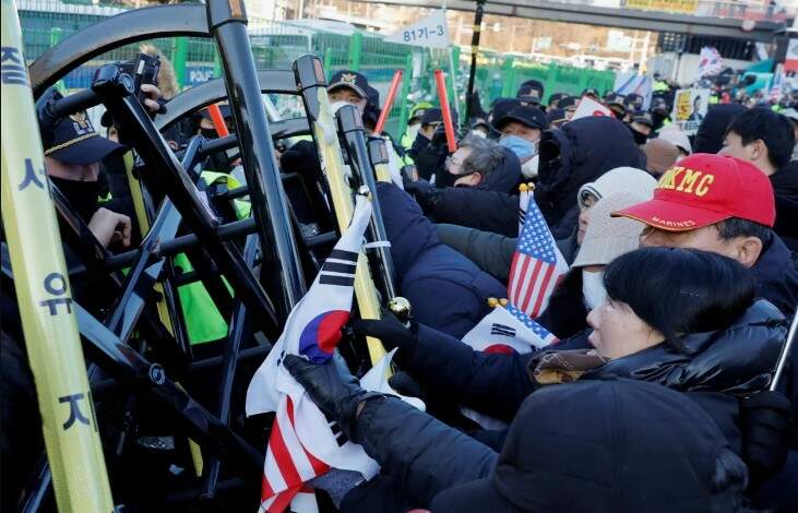Dezenas de apoiadores de Yoon se deitaram em uma avenida perto da residência, no centro de Seul, no início do dia, em protesto contra os investigadores, quando eles entraram no complexo oficial, no que se convertia na segunda tentativa de cumprir o mandado.