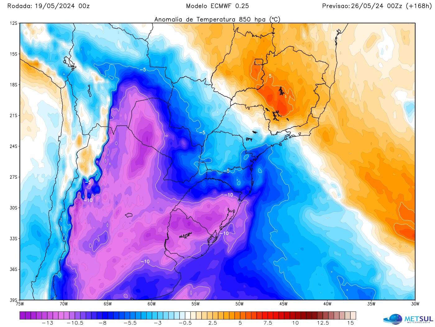 A MetSul Meteorologia alerta que a semana que se inicia vai ter um novo episódio de chuva com altos volumes e o ingresso de mais uma massa de ar polar, que será de maior intensidade que a última e trará frio muito intenso para o Rio Grande do Sul e áreas do restante do Sul do Brasil.