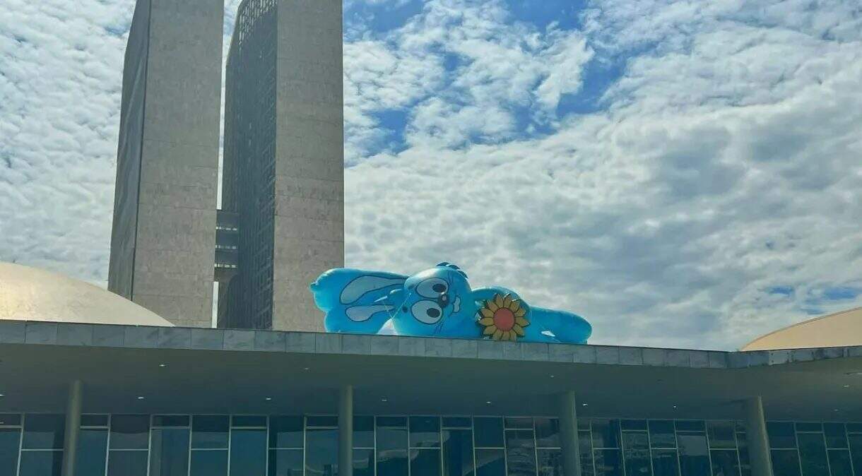 O coelho Sansão, mascote da Turma da Mônica, acordou debruçado sobre o prédio do Congresso Nacional nesta segunda-feira (04).