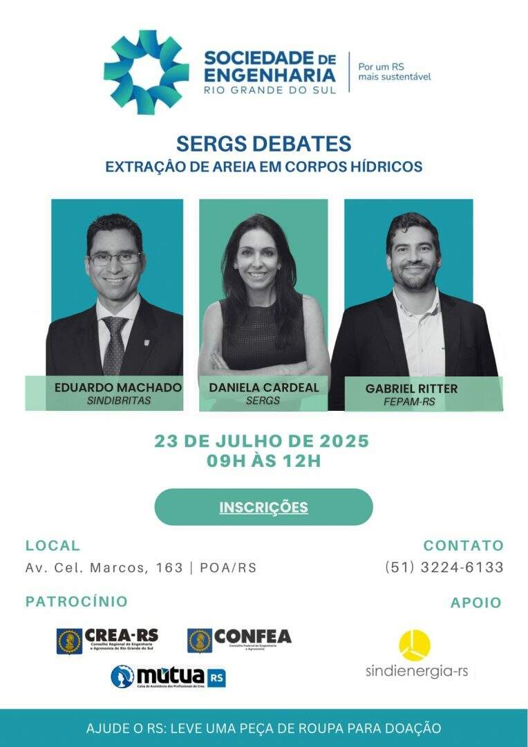 Ciente da complexidade técnica, ambiental e social envolvida nesse tema, a Sociedade de Engenharia do Rio Grande do Sul quer abrir as portas de sua casa para promover um diálogo qualificado e plural. Convida, para esse encontro, representantes da FEPAM, responsável pela elaboração do zoneamento ambiental, e do Sindibritas, entidade que congrega empresas do setor de mineração, para compartilharem suas visões e experiências.