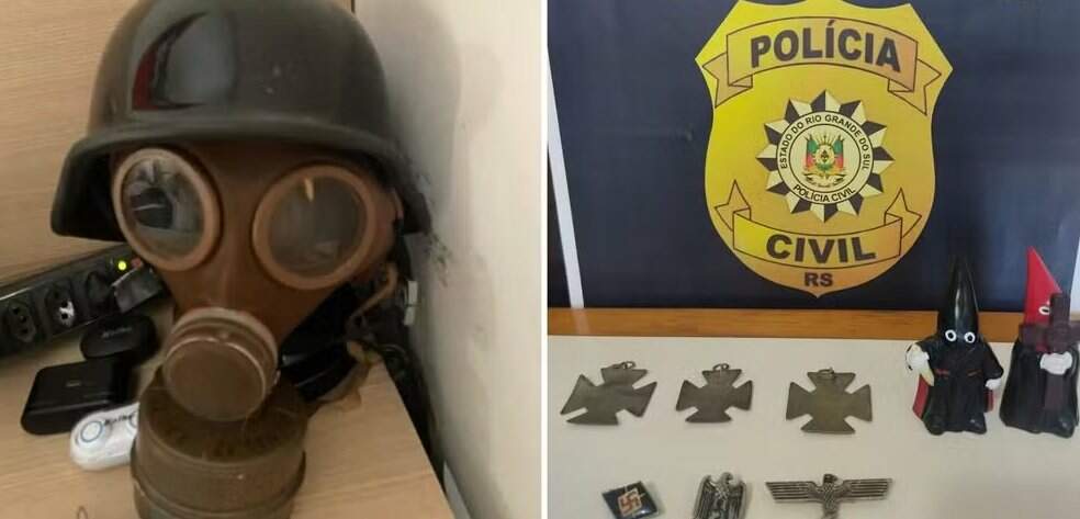 Na quinta-feira (6), agentes da Polícia Civil cumpriram um mandado de busca e apreensão em um imóvel de propriedade do suspeito, localizado na Estrada do Radar. Durante a ação, foram encontrados diversos itens associados ao nazismo, como capacete, máscara de gás, pingentes e estatuetas.