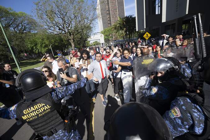 A sessão de votações da Câmara de Vereadores de Porto Alegre foi suspensa na tarde desta quarta-feira (15) após uma confusão generalizada envolvendo manifestantes, parlamentares e forças de segurança dentro e fora dos portões da Casa.