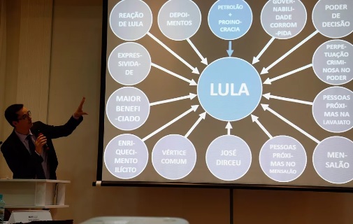 Durante a entrevista, Deltan usou uma apresentação de PowerPoint em que o nome de Lula aparecia no centro da tela, cercado por expressões como “petrolão + propinocracia”, “governabilidade corrompida”, “perpetuação criminosa no poder”, “mensalão”, “enriquecimento ilícito”, “José Dirceu”, entre outros.