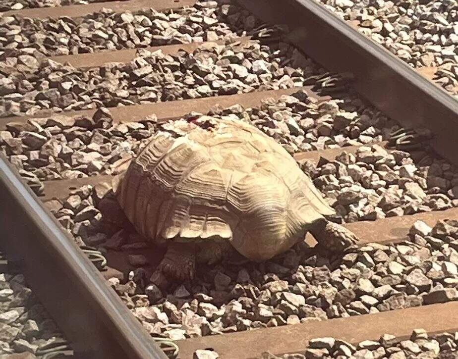 “Trem atrasado por causa de uma tartaruga gigante, pesada demais para levantar, presa nos trilhos do trem depois de ter escapado de um centro de vida selvagem local não é algo que eu pensei que ouviria de um maquinista”, disse uma das passageiras.