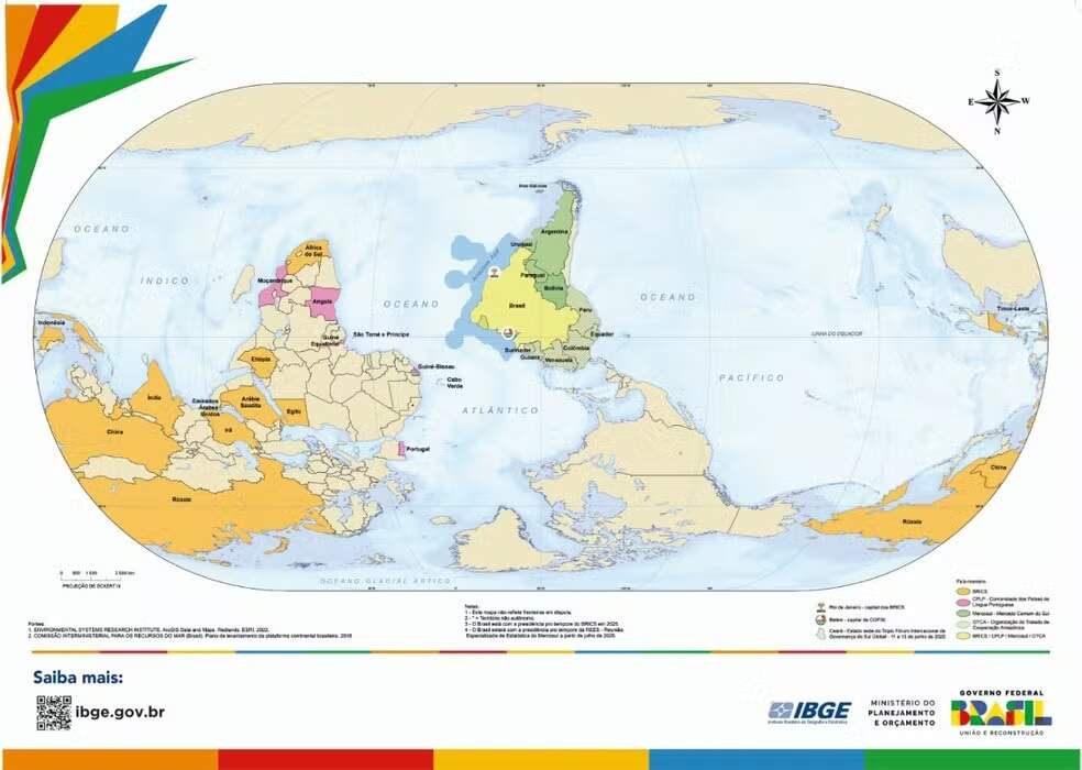 O novo mapa destaca os países que são membros do BRICS, do Mercosul, países de língua portuguesa e países que possuem o bioma amazônico, além das cidades do Rio de Janeiro, Belém e o estado do Ceará. As informações são do portal Estadão.