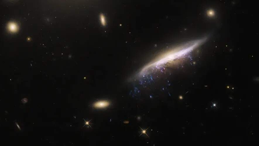 O telescópio Hubble da agência espacial americana Nasa captou a imagem de uma galáxia “água-viva”. Apesar de se parecer bastante com o animal, a galáxia JW100 tem esse aspecto por causa do fluxo de gás do corpo celeste, que parecem flutuar como tentáculos. Desses tentáculos, se formam estrelas.