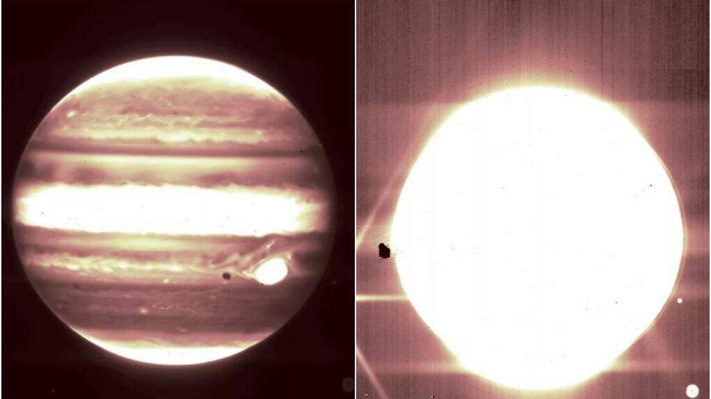 O telescópio espacial internacional James Webb capturou as primeiras fotos de Júpiter e de sua lua nesta quinta-feira (14). O enorme planeta foi visto por meio de infravermelho, que destaca suas diferentes faixas de cor. Na imagem também é possível ver a Grande Mancha Vermelha, que aparece como um grande ponto branco. A mancha é, na verdade, uma tempestade grande o suficiente para engolir a Terra.