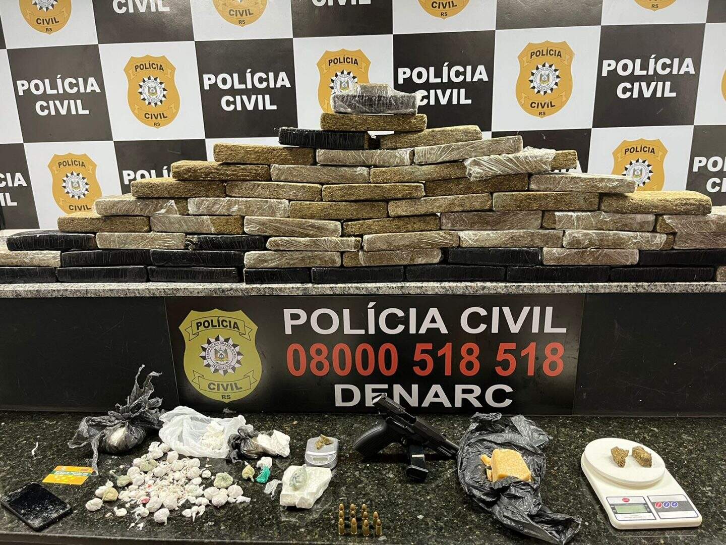 Logo após essa operação, os policiais também apreenderam uma pistola, seis quilos de maconha, 200 gramas de crack e 500 gramas de cocaína em uma residência que funcionava como depósito em Canoas. Não havia ninguém no local.