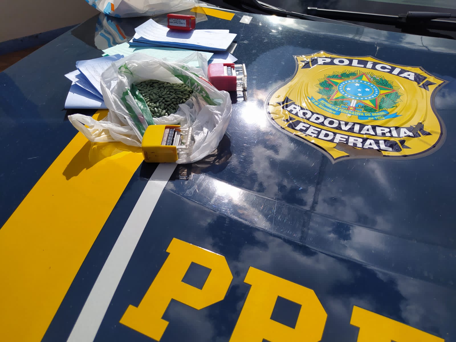 Em ação de fiscalização e combate ao crime, os agentes deram ordem de parada ao motorista de um Peugeot 206 com placas argentinas. Durante buscas no veículo, foram encontrados comprimidos de medicamento de uso controlado, além de centenas de receituários médicos adulterados e 2 carimbos de médicos falsificados escondidos embaixo do banco do carro.