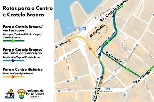 A partir desta quinta-feira (6), haverá mudanças no trânsito no entorno da Estação Rodoviária de Porto Alegre. Conforme a Empresa Pública de Transporte e Circulação (EPTC), os motoristas que quiserem acessar a Castelo Branco a partir do Túnel da Conceição deverão pegar o Largo Vespasiano Júlio Veppo. Não será mais permitido converter à direita na Castelo Branco passando pelos fundos da Rodoviária.