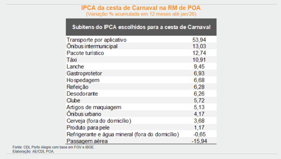 A chamada inflação do carnaval – cesta composta por 16 itens associados aos gastos típicos com a celebração – chegou a 5,8% no Brasil e a 6,2% na Região Metropolitana de Porto Alegre no acumulado dos últimos 12 meses até janeiro de 2026.