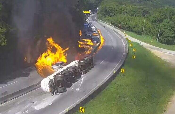 O acidente aconteceu na região conhecida como Morro dos Cavalos. Após o tombamento e explosão do caminhão, é possível ver o fogo se alastrando entre os demais veículos.