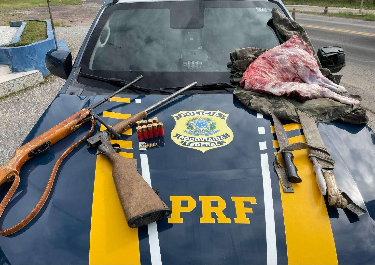 Na manhã desta quarta-feira (24), na BR-153, em Bagé, na Região da Campanha, a PRF (Polícia Rodoviária Federal) prendeu três homens, aprendeu duas armas e munições, além de dois animais abatidos. Eles estavam caçando e não possuíam autorização para a posse ou porte do armamento.
