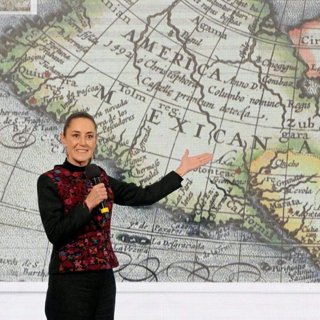 “Obviamente o Golfo do México é reconhecido pelas Nações Unidas. Mas por que não chamamos [os Estados Unidos] de ‘América Mexicana’? Nome bonito, né? Vamos chamar assim então”, afirmou Sheinbaum apontando para um mapa que mostra o México com territórios que atualmente são dos EUA, e com os EUA aparecendo em verde com nome de “América Mexicana” .