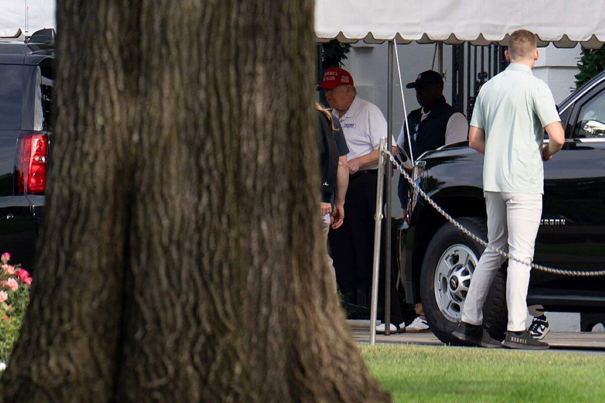 Ele estava vestido com calças pretas, uma camisa polo branca e um boné vermelho com a sigla MAGA (“Make America Great Again”, seu slogan político). De acordo com os repórteres no local, Trump estava acompanhado dos netos Kai e Spencer.