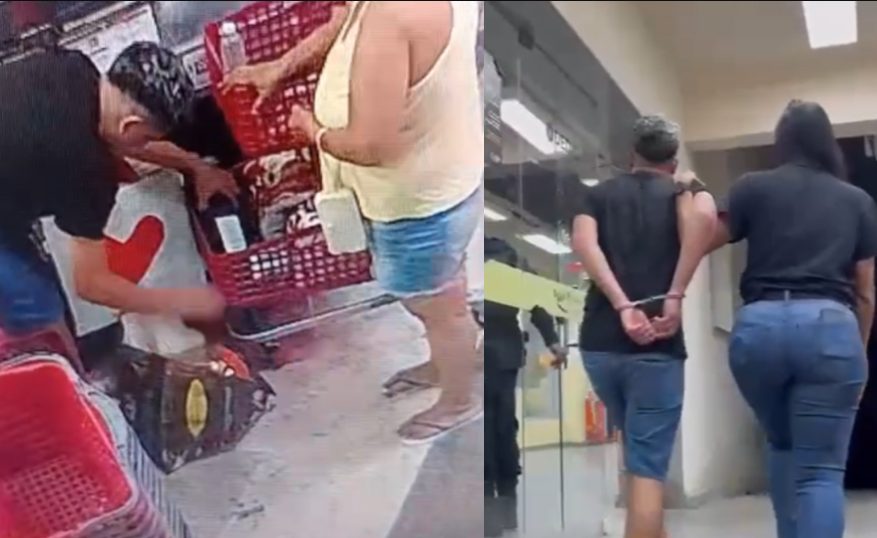 Imagens de câmeras de segurança mostram o momento em que um homem passa diversos itens pelo caixa enquanto, por trás do balcão, coloca as bebidas de alto valor diretamente em outra sacola, que está no chão. Uma senhora, de camiseta amarela, segura o carrinho durante a ação.