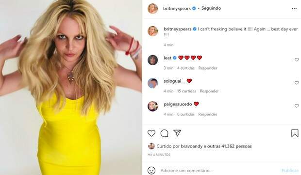 “Fizemos história hoje. Britney está livre!”, comemorou Sam Asghari, noivo de Britney. Ela também postou uma foto posada, com carão e sem legenda logo depois do anúncio do fim da tutela.