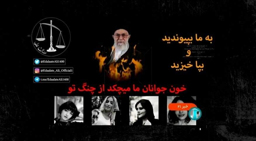 Ao lado das fotos na tela, havia uma mensagem que dizia: “Junte-se a nós e levante-se” e “O sangue de nossa juventude está pingando de suas garras”, junto com a indicação das contas nas redes sociais do grupo de hackers Edaalat-e Ali (Justiça de Ali, em português).